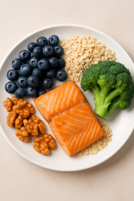 - 블루베리: 항산화 성분 풍부, 뇌 세포 노화 방지 - 연어: 오메가-3 지방산 다량 함유 → 기억력, 집중력 향상 - 달걀: 콜린 성분이 뇌세포막 구성에 필수 - 호두: 비타민E, 불포화지방산 풍부 → 인지력 개선 - 브로콜리: 비타민K, 항염 성분 풍부 - 귀리, 현미: 저당지 복합탄수화물로 안정적 에너지 공급 - 녹차: 테아닌 성분이 집중력과 긴장 완화에 도움 2. 피해야 할 식품